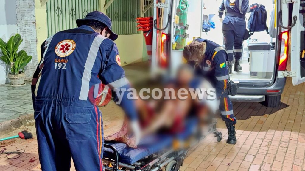 Os paramédicos chegaram ao local, e encontraram a vítima sentado em uma cadeira em via pública bastante ensanguentado.