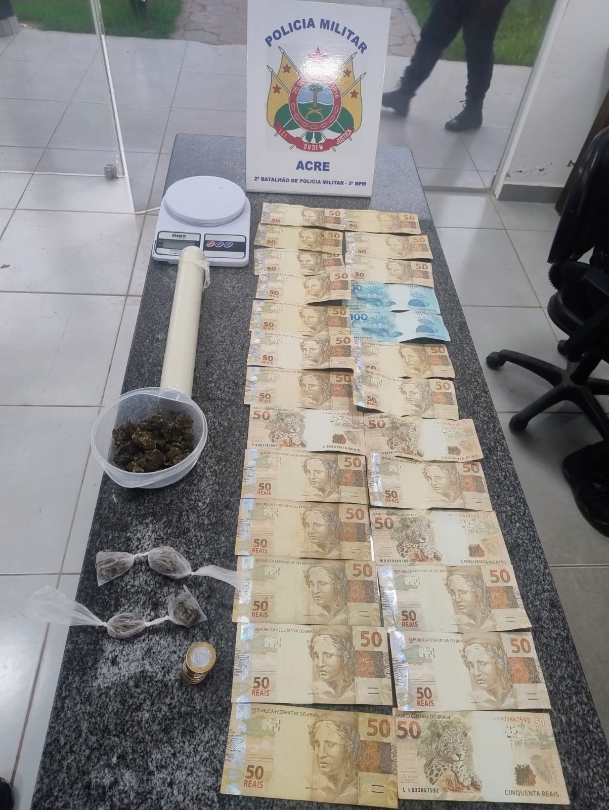 No local, foram apreendidas porções de drogas já embaladas para comercialização, além de dinheiro em espécie e uma balança de precisão. Os militares também recolheram materiais utilizados no fracionamento e preparo dos entorpecentes.