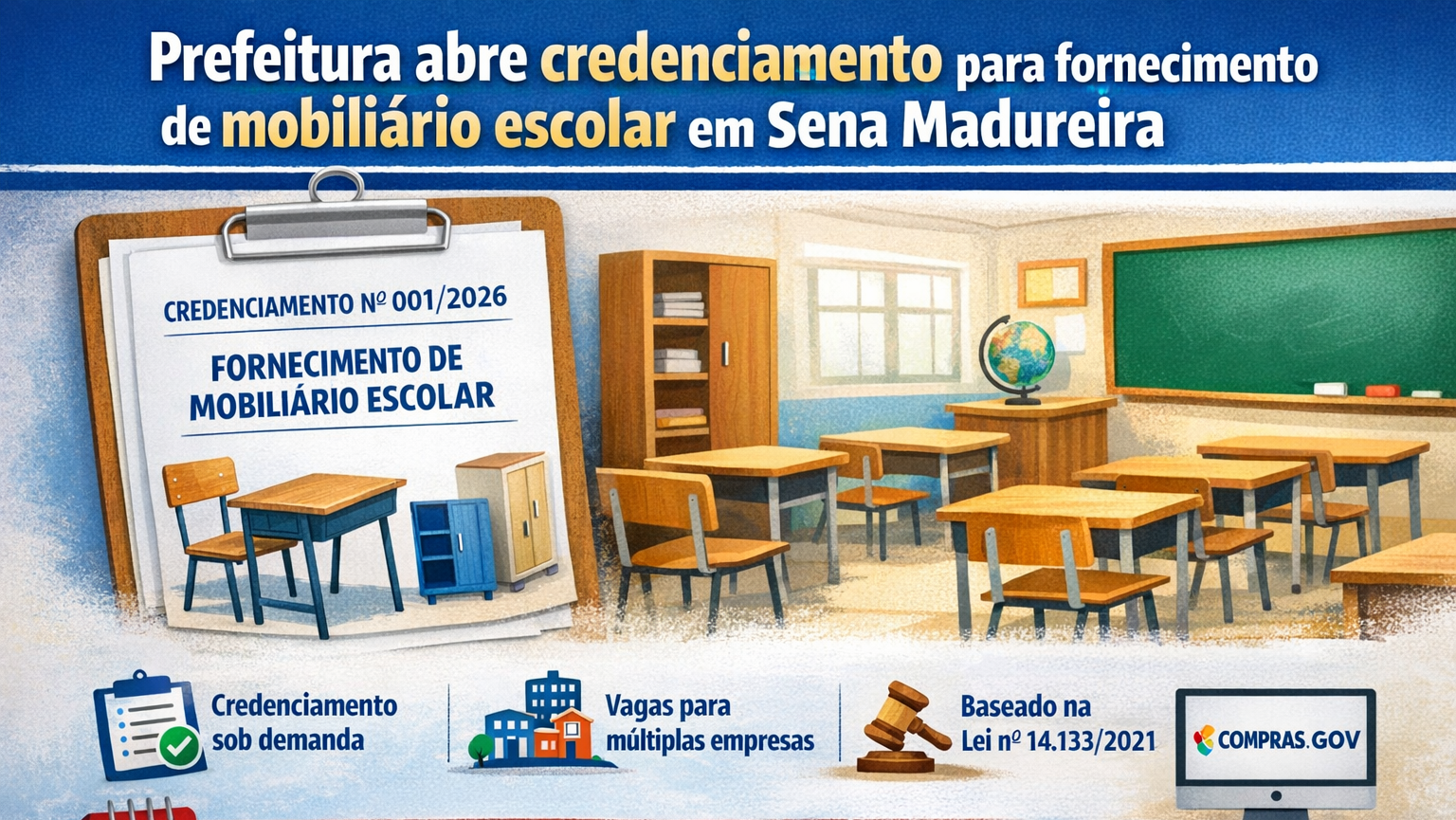 A Prefeitura de Sena Madureira anunciou a abertura de um novo processo de credenciamento público voltado para empresas interessadas em fornecer mobiliário escolar à rede municipal de ensino. A medida busca garantir a reposição e ampliação de itens como carteiras, mesas, bancos, armários e outros bens destinados às escolas da Secretaria Municipal de Educação.