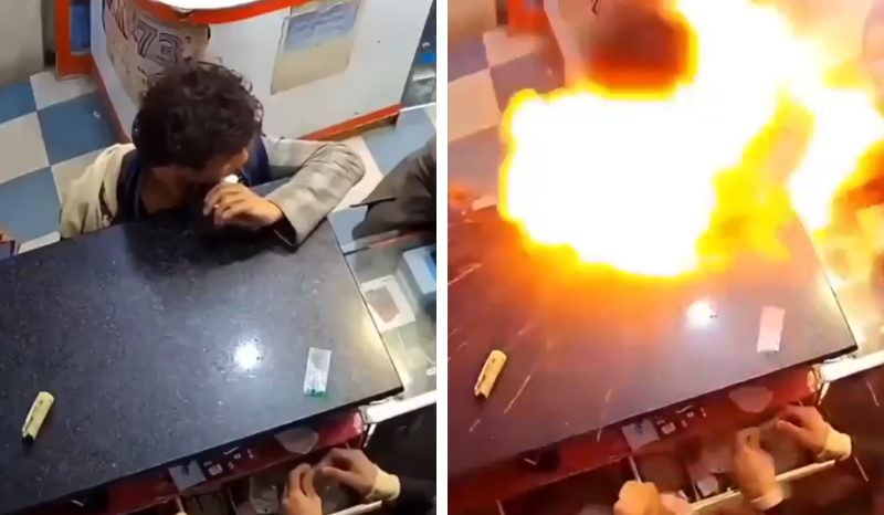 Um vídeo que circula nas redes sociais mostra o momento em que um homem morde a bateria de um celular e provoca uma explosão dentro de um estabelecimento comercial. O caso teria ocorrido na Índia e foi registrado por câmeras de segurança do local.