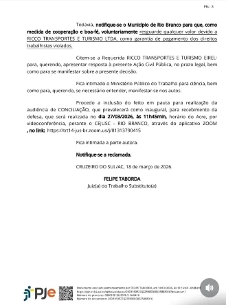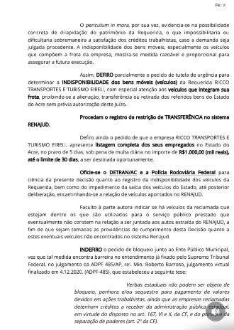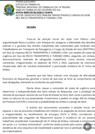 A Justiça do Trabalho determinou o bloqueio dos veículos da empresa Ricco Transportes e Turismo no Acre após identificar indícios de descumprimento de obrigações trabalhistas. A decisão foi assinada pelo juiz Felipe Taborda, da Vara do Trabalho de Cruzeiro do Sul, na quarta-feira (18), no âmbito de uma ação civil pública movida pelo Sindicato dos Trabalhadores em Transportes de Passageiros e Cargas do Estado do Acre (SINTTPAC).