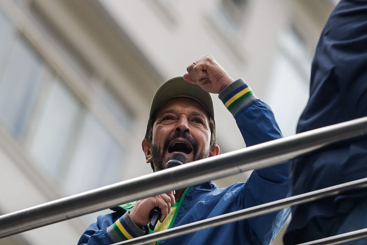 Prefeito Ricardo Nunes manda abraço do governador Tarcísio de Freitas a manifestantes na Paulista e diz que Flávio Bolsonaro ganha eleição