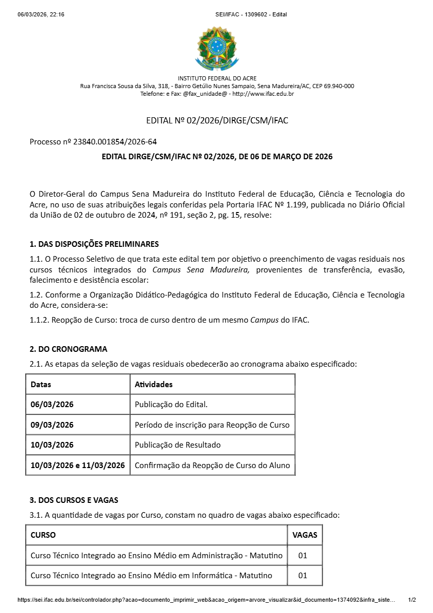 O Instituto Federal do Acre (Ifac) publicou o Edital nº 02/2026 que trata do processo seletivo para o preenchimento de vagas residuais nos cursos técnicos integrados ao Ensino Médio do campus de Sena Madureira.