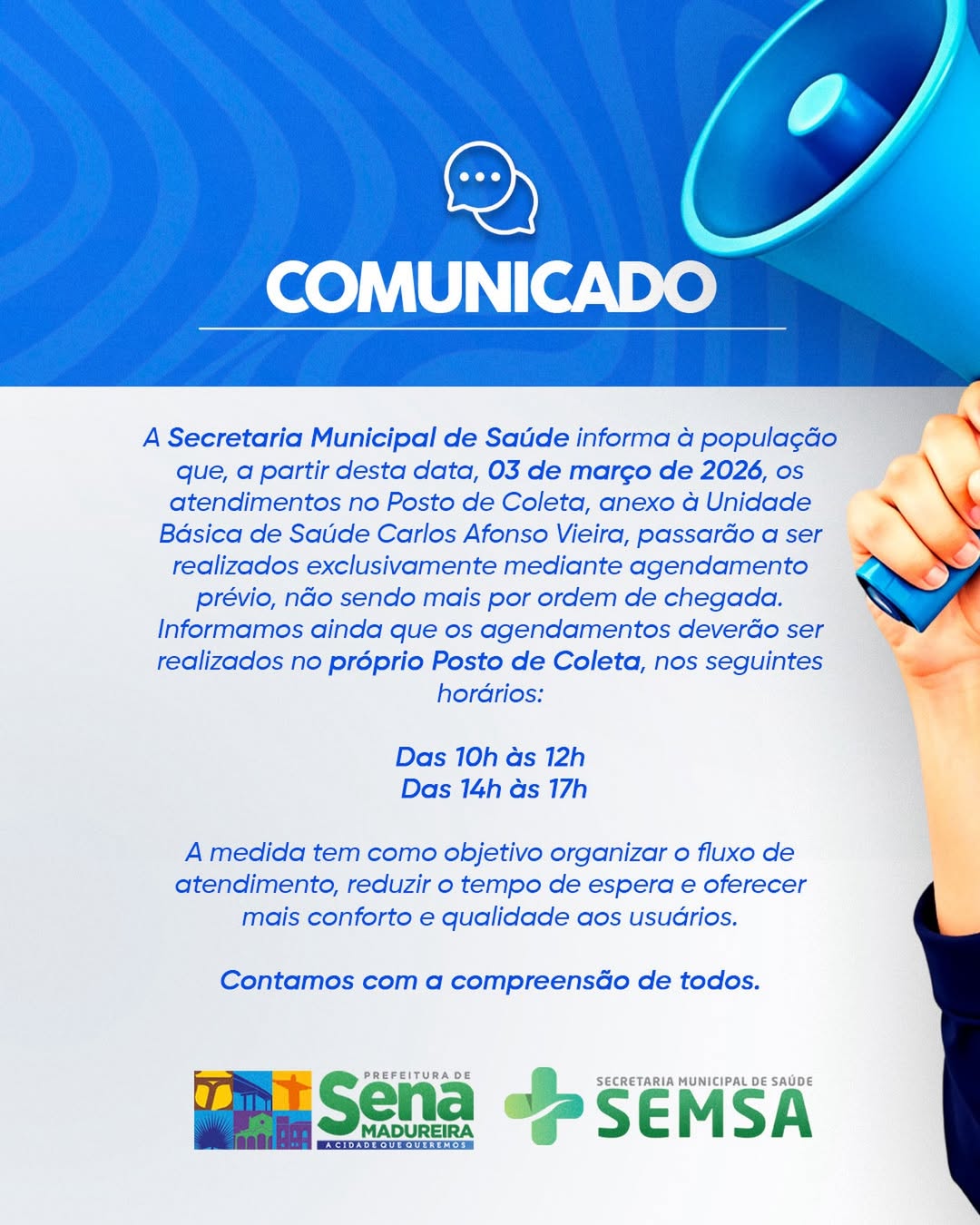 A Secretaria Municipal de Saúde de Sena Madureira informou que os atendimentos no posto de coleta, anexo à Unidade Básica de Saúde (UBS) Carlos Afonso Vieira, passarão a ser realizados somente mediante agendamento prévio. O comunicado foi divulgado na última quarta-feira, 4 de março.