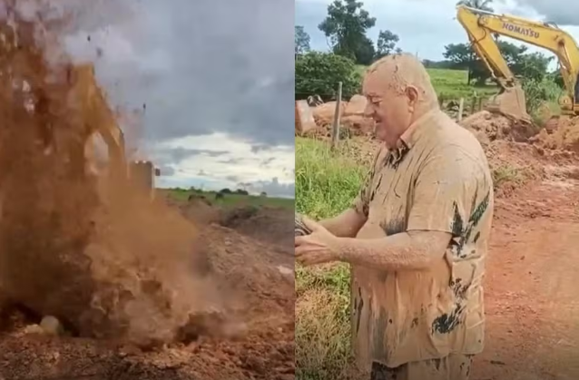 As imagens, divulgadas pelo próprio parlamentar nas redes sociais, mostram o momento em que uma retroescavadeira tenta remover uma pedra. De repente, o material cede e levanta uma onda de lama que atinge em cheio o vereador, que filmava a ação de perto.