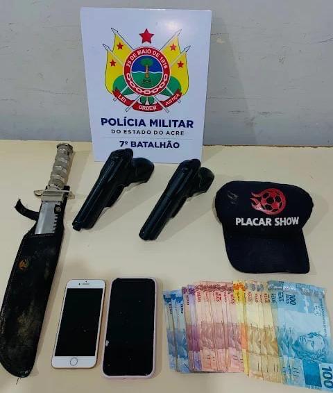Durante a abordagem, os policiais recuperaram dois aparelhos celulares e a quantia de R$ 874 em dinheiro, que havia sido levada durante a ação criminosa. Também foram apreendidos um simulacro de pistola e uma faca do tipo peixeira utilizados no assalto.