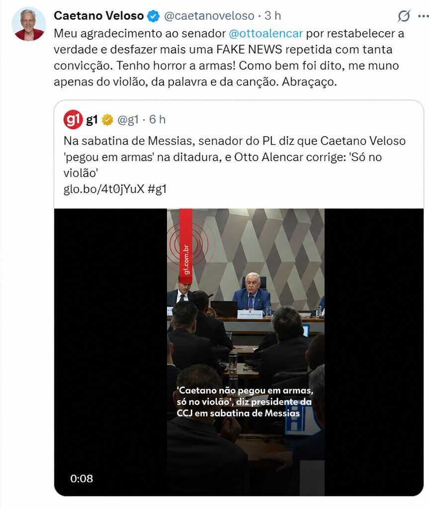 Em resposta pública, Caetano agradeceu a correção e desabafou: “Meu agradecimento ao senador Otto Alencar por restabelecer a verdade e desfazer mais uma fake news repetida com tanta convicção. Tenho horror a armas! Me muno apenas do violão, da palavra e da canção”, afirmou o artista. Registros históricos confirmam que a prisão de Caetano em 1968 ocorreu por sua atuação artística, sem qualquer menção a atividades de guerrilha.