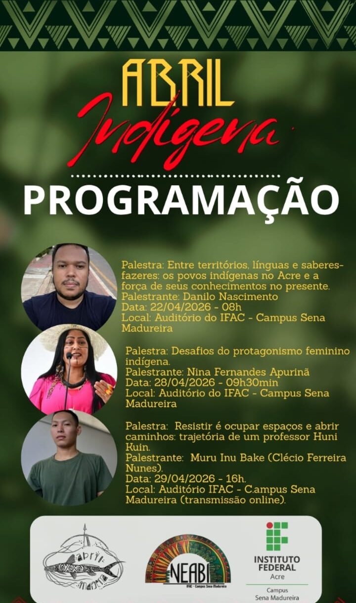 O Instituto Federal do Acre (IFAC), Campus Sena Madureira, vai realizar uma programação especial em alusão ao “Abril Indígena”, com uma série de palestras voltadas à valorização dos povos originários e à reflexão sobre seus saberes, cultura e protagonismo.