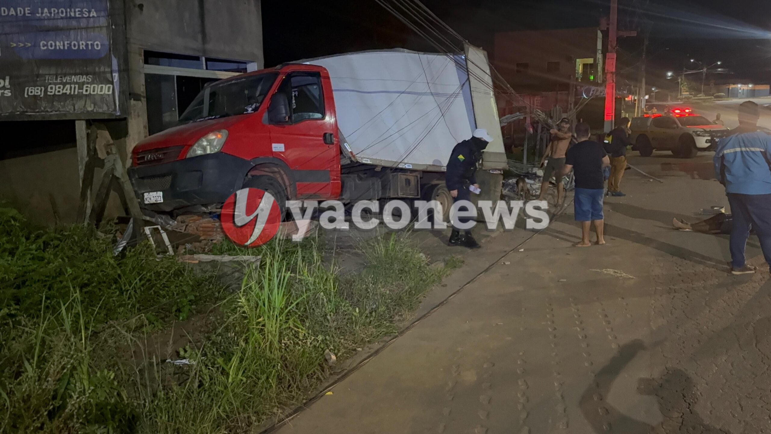De acordo com informações preliminares, um caminhão baú de pequeno porte, modelo Iveco/Daily de cor vermelho, seguia no sentido Tancredo Neves pela estrada das Placas, quando de forma repentina perdeu o controle, bateu na traseira de um carro modelo Renault KWID de cor prata que estava estacionado, derrubou um poste de energia e invadiu um estabelecimento comercial.