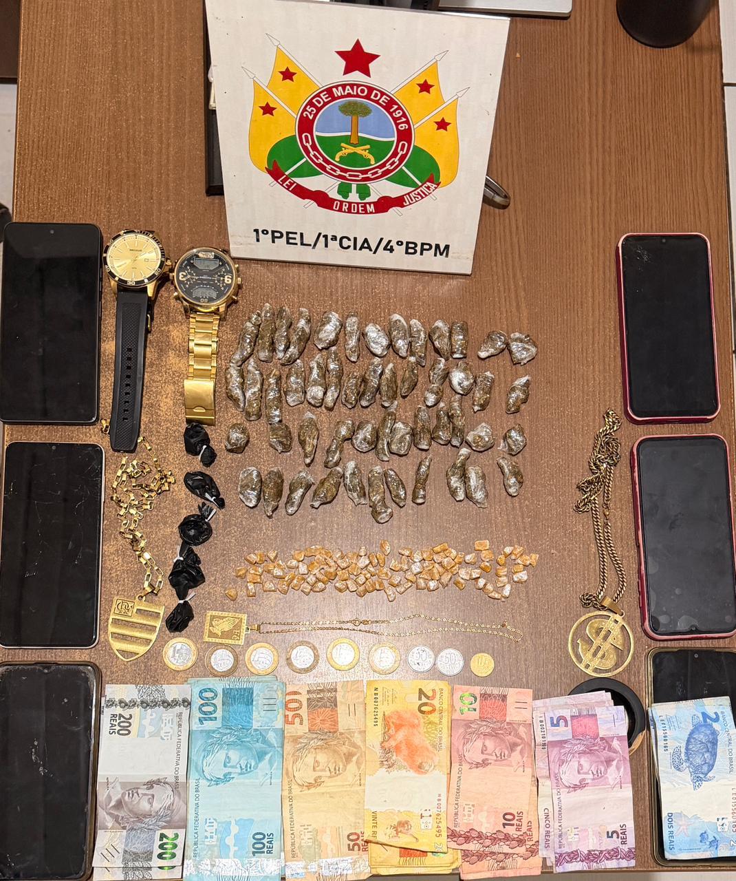 Segundo a PM, o suspeito se rendeu após a verbalização e admitiu possuir mais entorpecentes guardados em uma bolsa. Durante as buscas no imóvel, os policiais encontraram seis celulares, dois relógios, três cordões e uma quantia em dinheiro que somava R$ 2.578,10, além das drogas apreendidas.