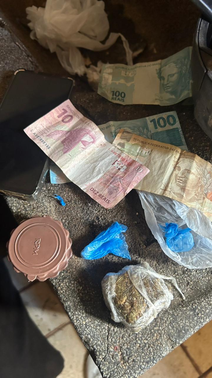 Durante a operação, os policiais localizaram cerca de 26 trouxinhas de maconha e um invólucro contendo cocaína. Além das drogas, também foi apreendida uma quantia em dinheiro, que, segundo a equipe, pode ter origem na comercialização ilegal de entorpecentes.