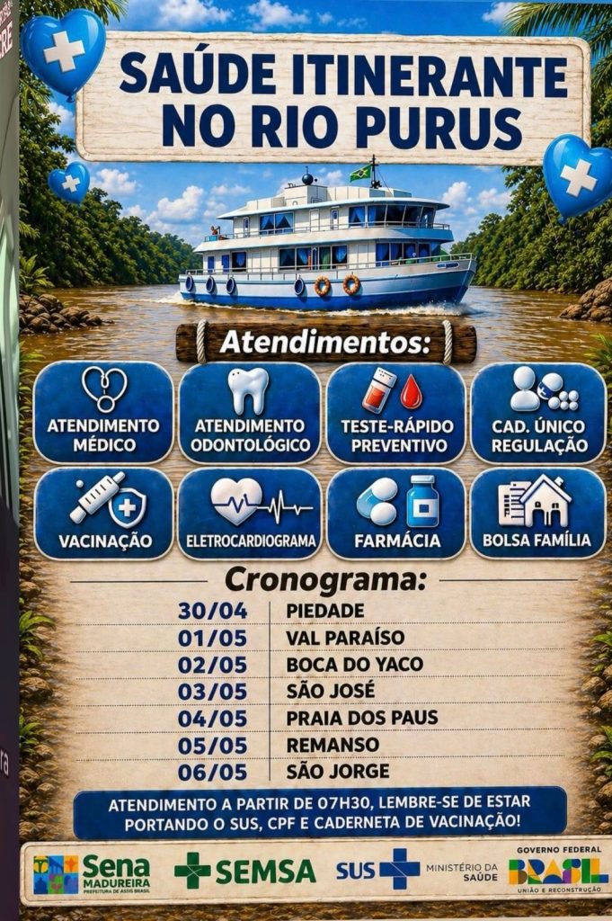 A Prefeitura de Sena Madureira, via Secretaria Municipal de Saúde (SEMSA), anunciou uma nova etapa do programa Saúde Itinerante. Entre os dias 30 de abril e 6 de maio, uma equipe multidisciplinar percorrerá diversas comunidades ribeirinhas do Rio Purus para oferecer assistência médica e social básica.