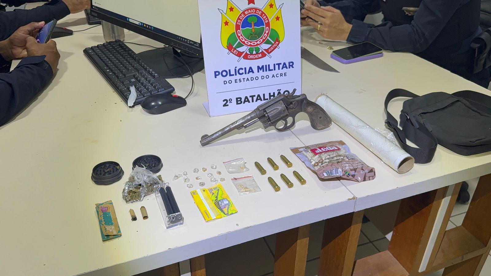 Durante a abordagem, os policiais confirmaram que se tratava de um menor de idade. Na revista, foi encontrada dentro de uma bolsa um revólver calibre .38 com seis munições intactas, além de uma quantidade de entorpecentes.
